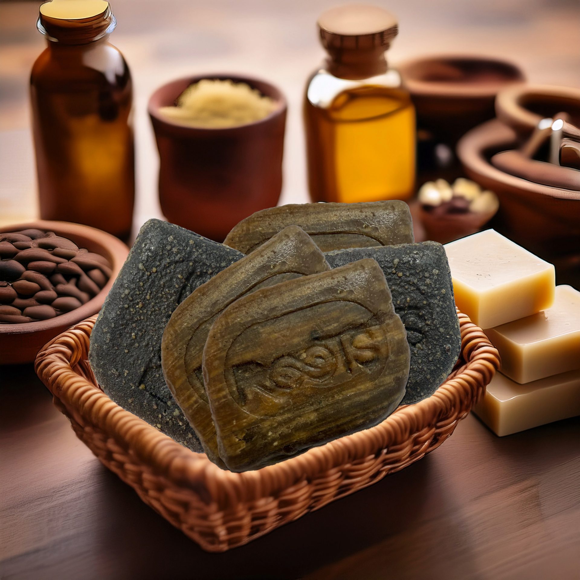 Afrikanische schwarze Seife ist ein vielseitiges Naturprodukt, das für Gesicht, Körper und Haare verwendet werden kann.
